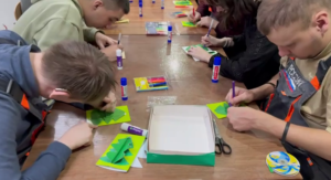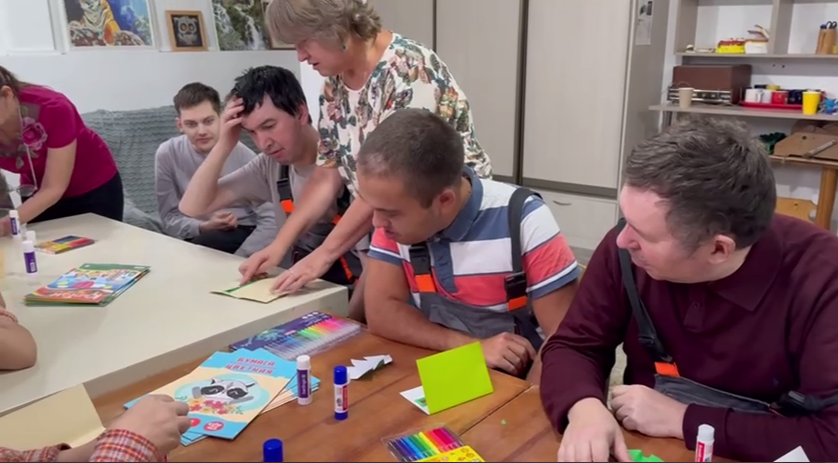 Предновогодние мастер-классы проводились не только гостями, но и сами ребята готовили тему и материалы, учились проведению занятия, а затем учили других. Младшие сотрудники полиграфической мастерской подготовили интересное мероприятие по изготовлению новогодних открыток. Они сделали трафареты, принесли ножницы, цветную бумагу и клей и показали, как можно недорого и красиво поздравить друзей с Новым годом. Из плотного картона ребята вырезали открытки, в центр поместив елочки из цветной бумаги. А вся изюминка заключалась в том, что елочка с обложки попадает внутрь при открывании. Получилось весьма неплохо, а вот подписать сумели не все. Поэтому те, кто умел, помогал товарищам. Участие ребят в проведении занятий, когда они сами готовятся и проводят их, дает дополнительный стимул личному росту, позволяет стать самостоятельнее.